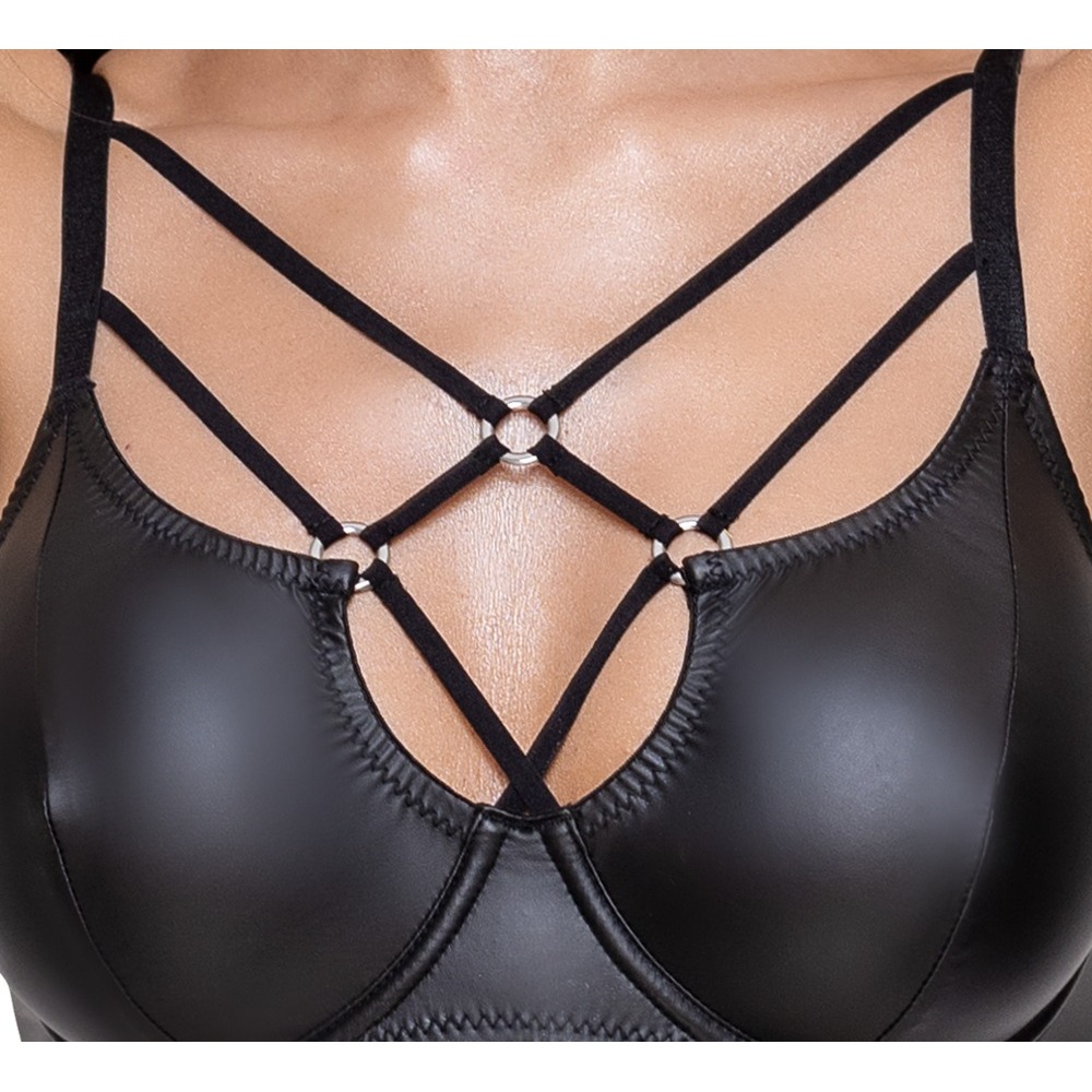 A bra with underwired cups and a Rio string in a set from Cottelli LINGERIE. Beautiful black matte look material with decorative stretchy straps and silver-coloured rings in the cleavage area and at the front of the string’s waistband. It is stretchy, which means that it is a perfect fit and also feels comfortable to wear. The bra has adjustable straps and a hook fastener at the back.