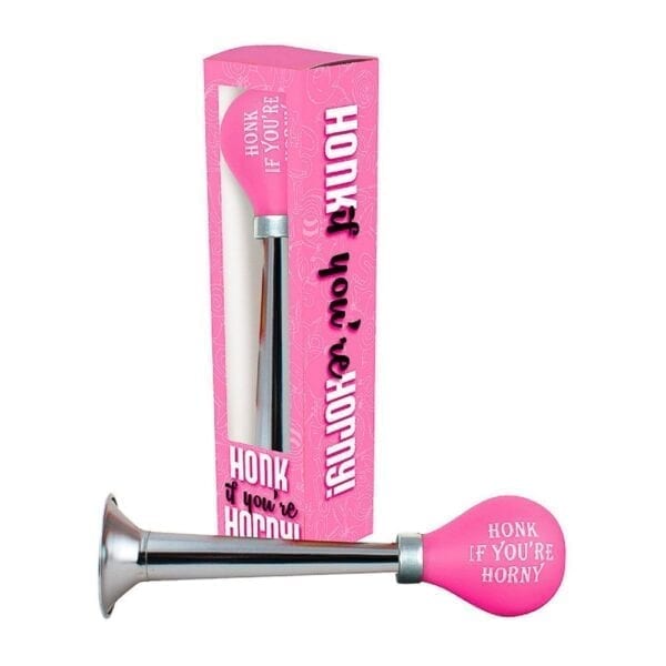 Pink and silver horn with Honk If Your Horny printed on it. Just squeeze the bulb to notify your partner you need them.